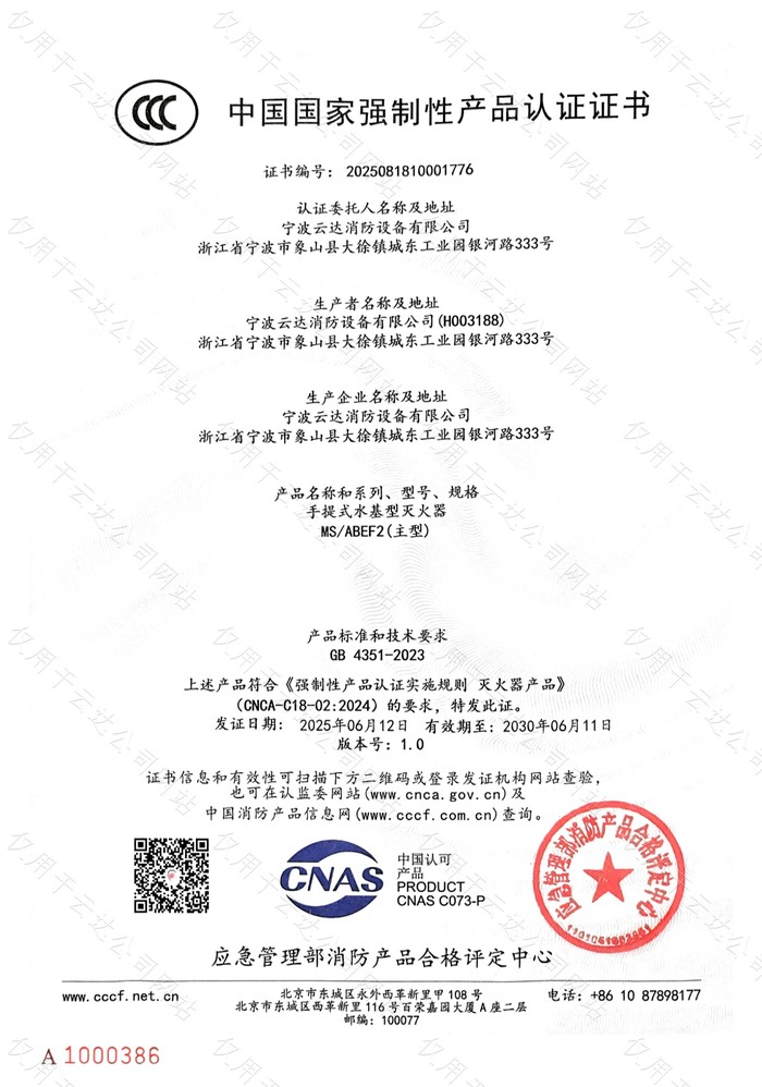 MS/ABEF2 手提式水基型灭火器 3C证书