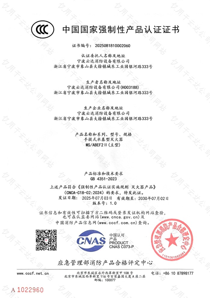 MS/ABEF2 手提式水基型灭火器 3C证书